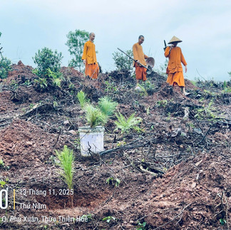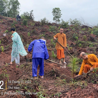 Sau đợt mưa bão vừa qua, vào sáng thứ Năm ngày 13/11/2025, trong làn mưa nhẹ bay bay, Quý Thầy cùng Phật tử đã bắt tay triển khai trồng cây. Từng gốc thông non, từng mầm sến nhỏ được đặt xuống đất mẹ với tất cả sự trân trọng, mong sớm phủ xanh khuôn viên chùa, giữ đất – giữ nước, kiến tạo môi trường sống cho nơi địa linh nhân kiệt này!
